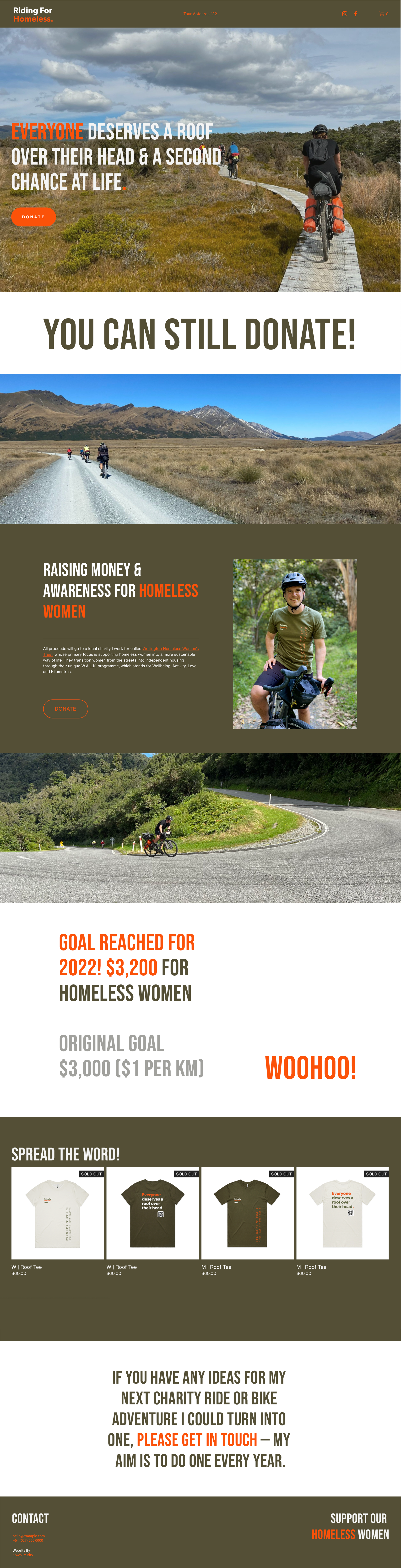 Riding for Homeless was an event run as part of the Tour Aotearoa 2022. The event was a cycling adventure that started in Cape Reinga to Bluff. Through the event, donations were gathered and gifted to Wellington Homeless Women’s Trust once the adventure was completed.